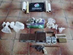 A primeira residência que a guarnição diligenciou fica localizada na Estrada Geral do bairro Campinho. No local, a PM apreendeu 520 gramas de cocaína, 88 gramas de crack, 1.741KG de maconha, balança de precisão digital, papel para enrolar droga, revólver calibre 32, sete munições calibre 44, dez munições calibre 38 e 68 munições calibre 380.