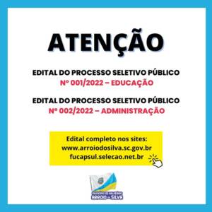 A Administração Municipal de Balneário Arroio do Silva torna público Edital do Processo Seletivo Público nº 001/2022 – Educação; e Edital do Processo Seletivo Público nº 002/2022 – Administração.
