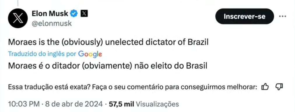 Em outra postagem, Musk diz: “Moraes é o ditador obviamente não eleito do Brasil”. Este debate tem gerado repercussão internacional, com muitos defensores de Musk e também de Moraes.