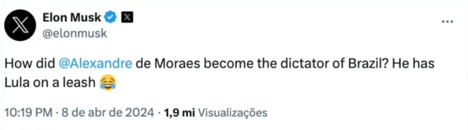 Dono da rede social “X” (antigo Twitter), Elon Musk, continuou desferindo criticas contra o atual Ministro do Supremo Tribunal Federal Alexandre de Moraes. Em uma série de publicações em sua rede social pessoal, diz que “Alexandre de Moraes se tornou o ditador do Brasil, porque colocou o atual Presidente da República, Luiz Inácio Lula da Silva em uma coleira”.