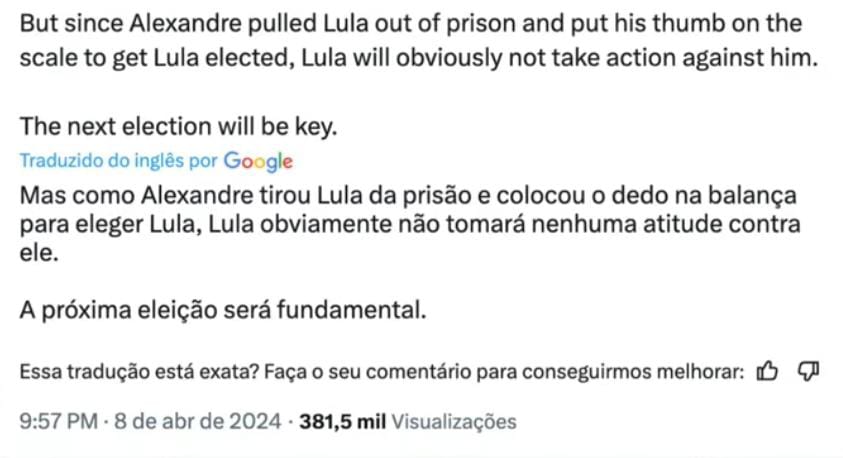 Elon Musk ressaltou que Alexandre de Moraes deve passar por um julgamento mediante a seus crimes. O bilionário ainda Afirmou que o Ministro do STF teria tirado Lula da prisão, e auxiliado na sua candidatura.