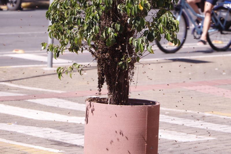 Um grande enxame de abelhas causou surpresa e preocupação na manhã desta quinta-feira (14) em Sombrio. O enxame se instalou na Avenida Getúlio Vargas, movimentando pedestres e comerciantes da região. O Corpo de Bombeiros foi acionado e isolou a área para evitar incidentes.