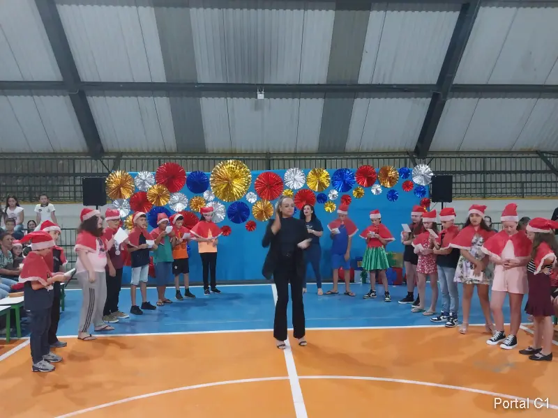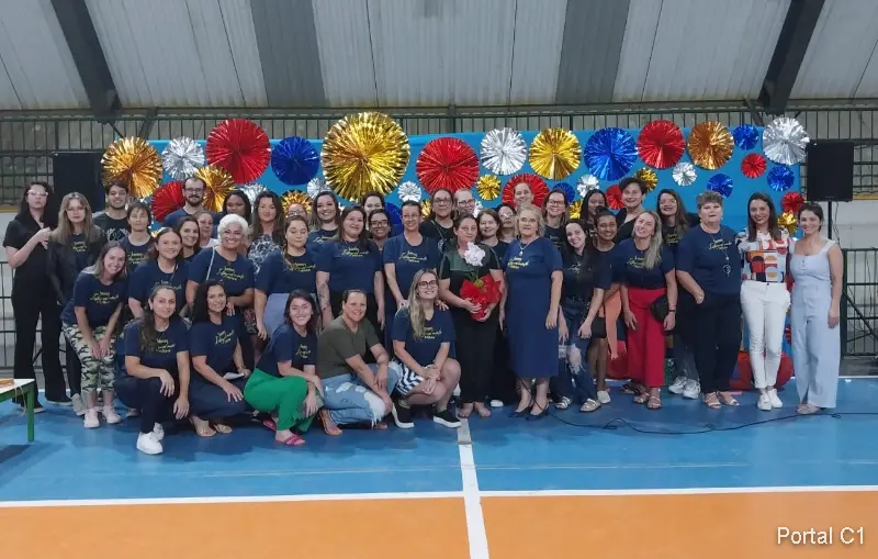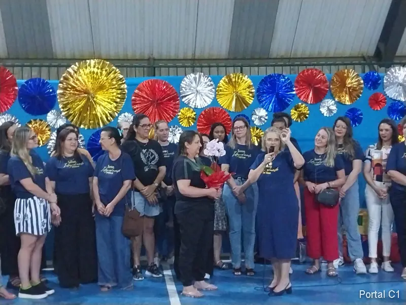 Professores, servidores, alunos e suas famílias lotaram o ginásio de esportes da escola em uma grande noite com apresentações culturais, homenagens e uma surpresa de tirar o fôlego.
