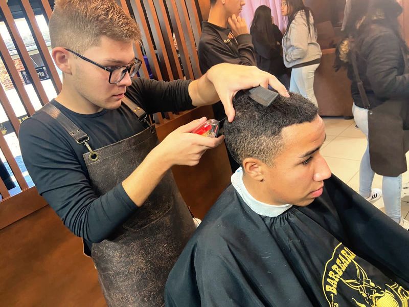 Alunos do Ensino Médio da Escola Praia da Gaivota estão tendo gratuitamente o curso de Barbearia com o barbeiro Vinícius Coelho, outro parceiro da iniciativa