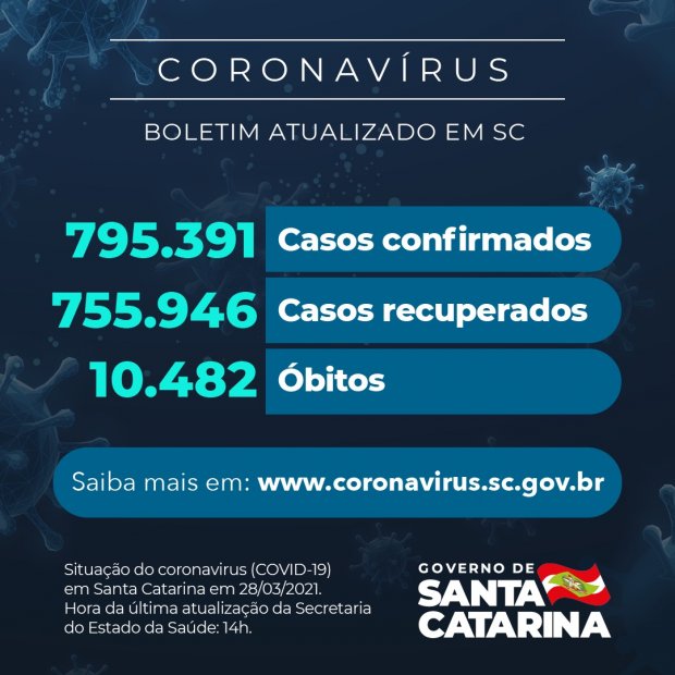 Há 795.391 casos confirmados de Covid-19 em Santa Catarina, dos quais 755.946 estão recuperados e 28.963 permanecem em acompanhamento. O balanço foi divulgado neste domingo, 28. O novo coronavírus causou 10.482 óbitos no estado até esta data. Com isso, a taxa de letalidade é de 1,32%.