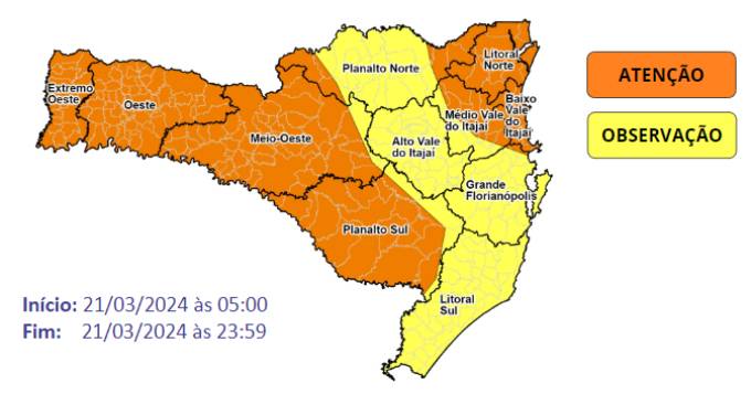 Nesta quinta-feira (21), o tempo muda em Santa Catarina com o avanço de uma frente fria, que traz chuva para a maioria das regiões, começando pelas áreas de divisa com o Rio Grande do Sul (Grande Oeste e Planalto Sul) a partir do final da madrugada e início da manhã.