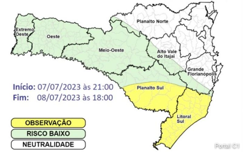 Entre a noite desta sexta-feira (07) e a tarde de sábado (08), o avanço de uma frente fria entre o Rio Grande do Sul e Santa Catarina, aliado ao processo de formação de um ciclone extratropical sobre o oceano, na altura da costa de Santa Catarina, favorece a ocorrência de temporais isolados entre o Oeste e o Litoral Sul do estado.