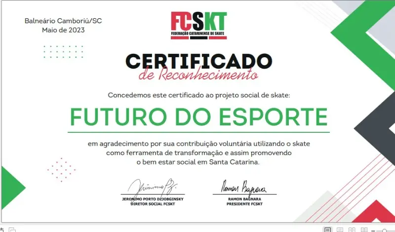 O Projeto sombriense Futuro do Esporte recebeu na última semana uma grata surpresa. A Federação Catarinense de Skate – FCSKT enviou uma carta e um certificado de reconhecimento ao projeto, por fazer do esporte uma ferramenta de transformação.