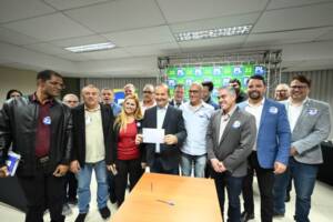O coordenador regional do PL no Vale do Araranguá e assessor especial da Casa Civil, André Fernandes, o prefeito de Ermo, Paulinho Della Vecchia e o assessor da deputada Júlia Zanatta, Robson Pizzolo, Prefeito de Balneário Gaivota Everaldo Kekinha dos Santos, participaram da cerimônia de em que tiveram suas fichas abonadas por Jorginho Mello.