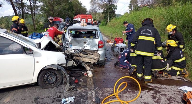 Conforme os bombeiros, a colisão envolveu três veículos: um Kia Sportage, um Volkswagen Fox e um Toyota Etios.