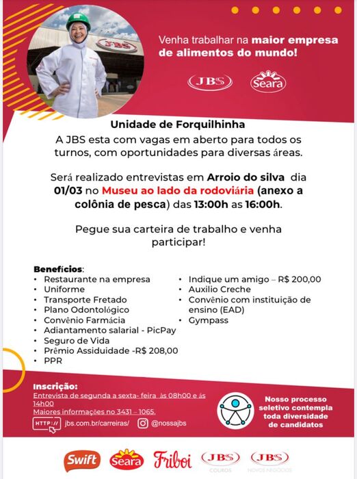 A empresa JBS estará em Balneário Arroio do Silva nesta quarta-feira (01) para realizar entrevistas para preenchimento de vagas em aberto. Há vagas para todos os turnos com oportunidade para diversas áreas.
