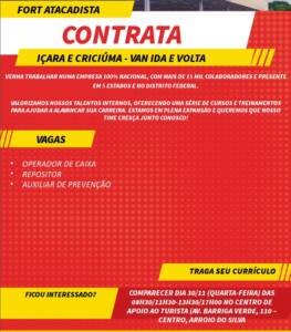 A equipe da empresa Fort Atacadista estará em Arroio do Silva nesta quarta-feira, dia 30, realizando entrevistas com moradores que estão à procura de oportunidade de emprego. O Fort tem disponível vagas de operador de caixa, repositor e auxiliar de prevenção. As vagas são para Içara e Criciúma, mas a empresa disponibiliza transporte (van).