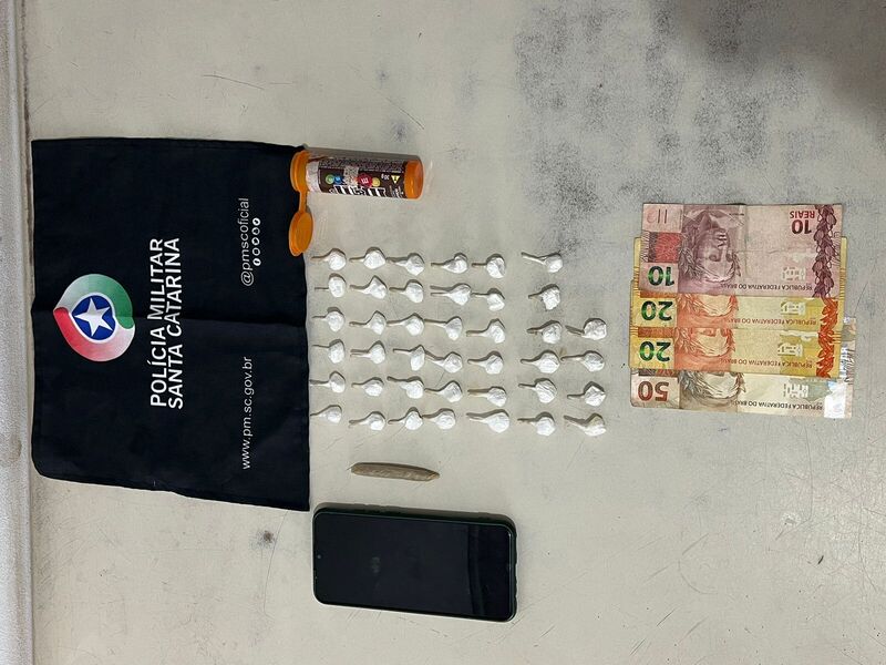 No total, foram apreendidas 40 porções de cocaína, pesando aproximadamente 35,36 gramas, além de 1,34 gramas de maconha, R$ 100 em dinheiro e um smartphone. O homem recebeu voz de prisão, teve seus direitos lidos e optou por permanecer em silêncio.