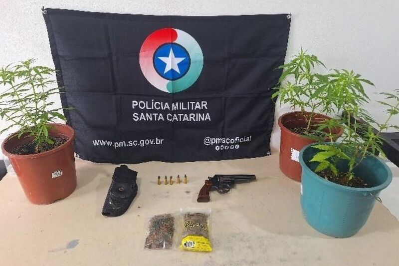 Os policiais identificaram, em uma varanda, três pés de maconha em crescimento. Diante do flagrante, a guarnição abordou o proprietário da residência, um homem de 26 anos. Durante as buscas no local, além das plantas, foram encontrados aproximadamente 80 gramas de maconha já pronta para consumo e um revólver calibre .38 com cinco munições intactas.