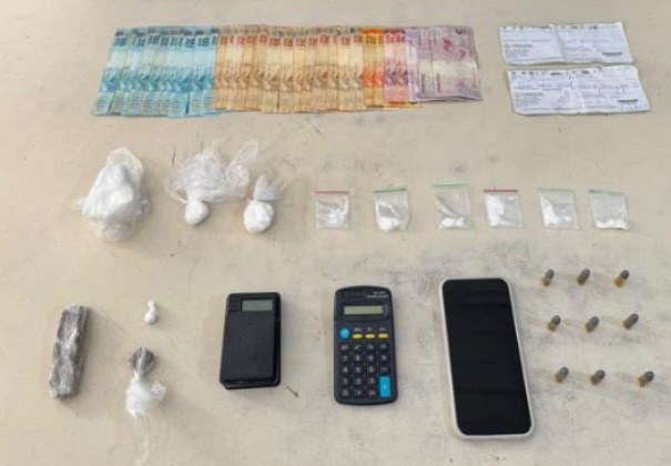As diligências continuaram na residência da mãe do suspeito. No local, foi encontrada uma mochila contendo aproximadamente 71 gramas de cocaína, 30 gramas de maconha, 9 munições calibre .32 e anotações relacionadas à comercialização de drogas.