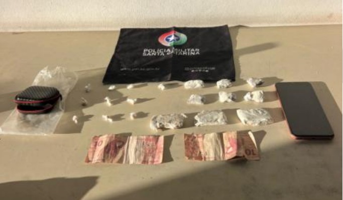 Durante o patrulhamento, os policiais flagraram o suspeito entrando no imóvel. Na abordagem, foram encontradas dez pedras de crack (2,79g), nove porções de maconha (56,55g), R$ 20 em espécie e dois aparelhos celulares. Todas as drogas estavam embaladas para a comercialização.