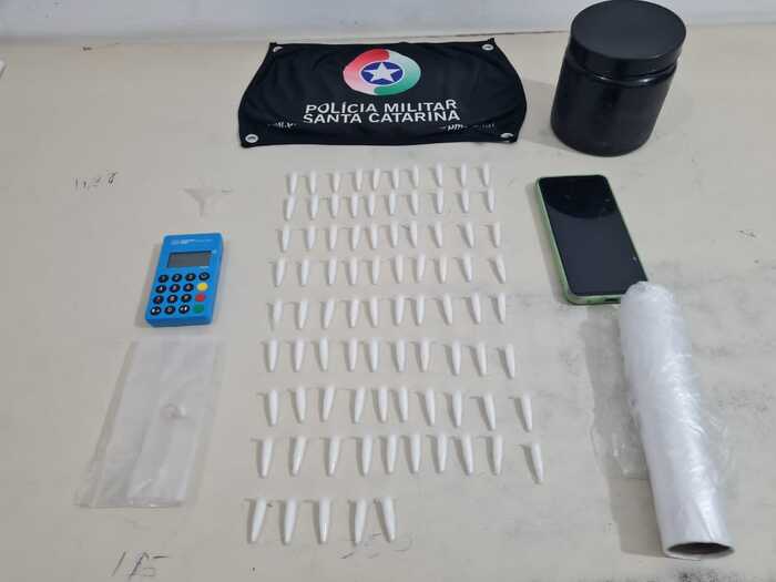 Na casa do traficante foram encontrados, escondidos dentro do banheiro, um pote com 85 pinos de cocaína e um funil utilizado para embalar a droga. Com ele havia R$ 30,00 em notas diversas, a guarnição acredita que, durante a fuga, ele dispensou as pedras de crack no qual não foram localizadas.