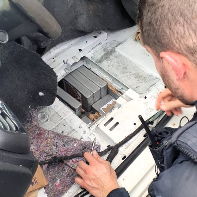 Os cães farejadores da PRF Charlie e Athena deram sinal positivo para a presença de entorpecente no piso do veículo.