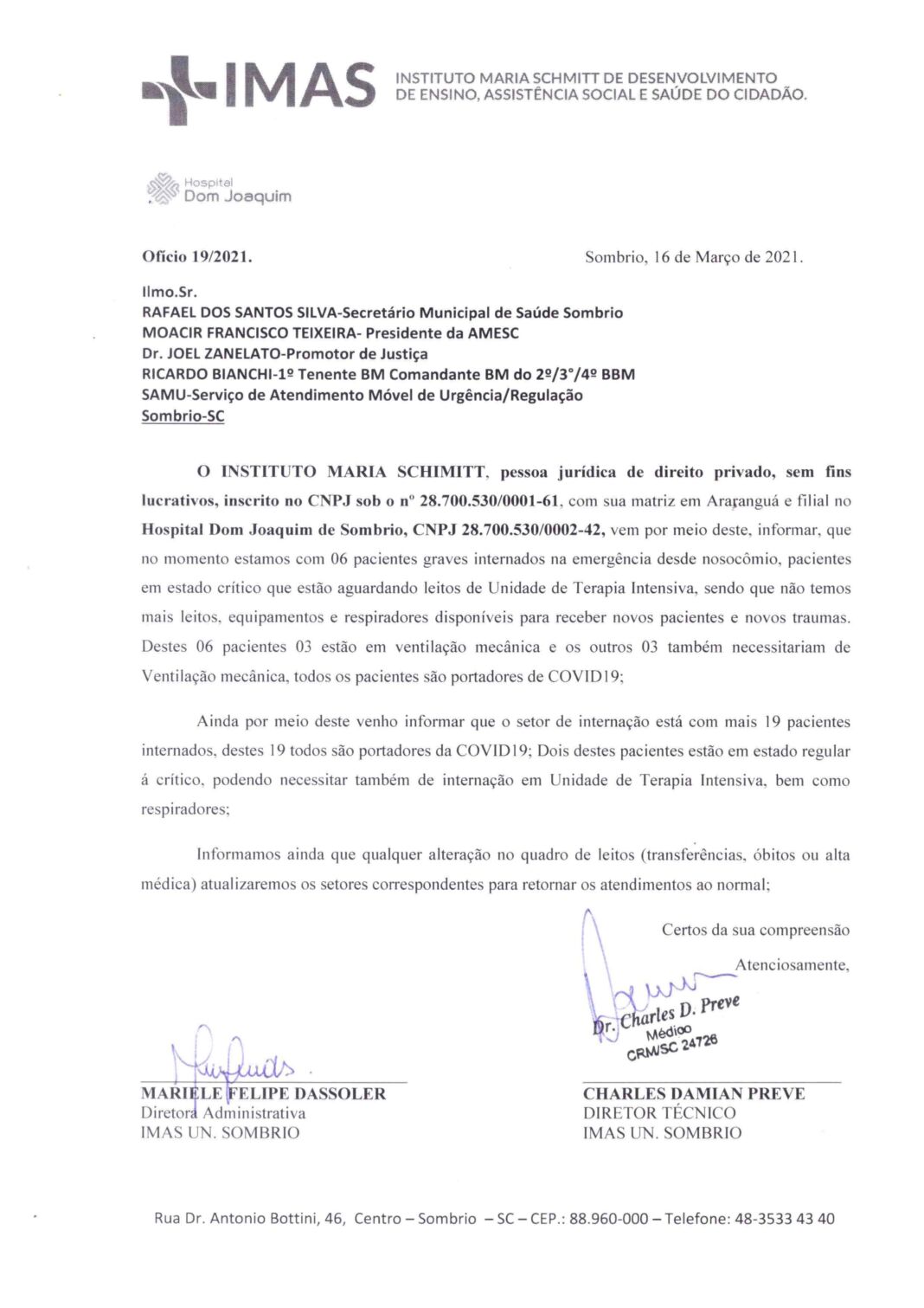 Hospital Dom Joaquim alerta autoridades sobre situação extremamente grave em relação a pandemia