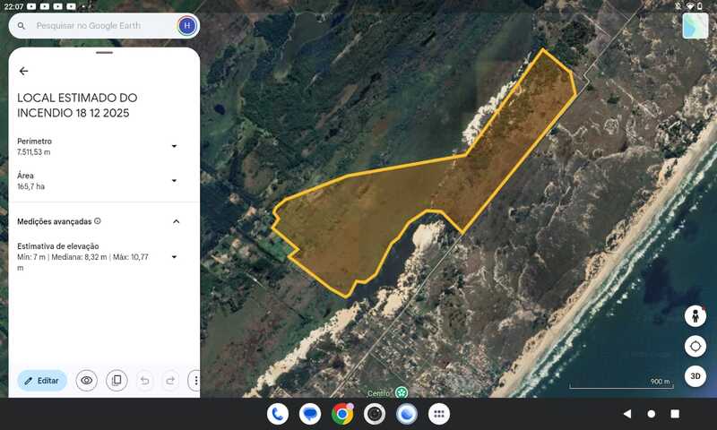 De acordo com o Corpo de Bombeiros, a área atingida foi de aproximadamente 1.657.019 metros quadrados, o equivalente a cerca de 165 hectares. Para conter o incêndio, foram empregadas viaturas de Sombrio, além do caminhão de Araranguá. O combate contou com o uso de linha direta de ataque, batedores, bombas costais, sopradores e a abertura de aceiros.