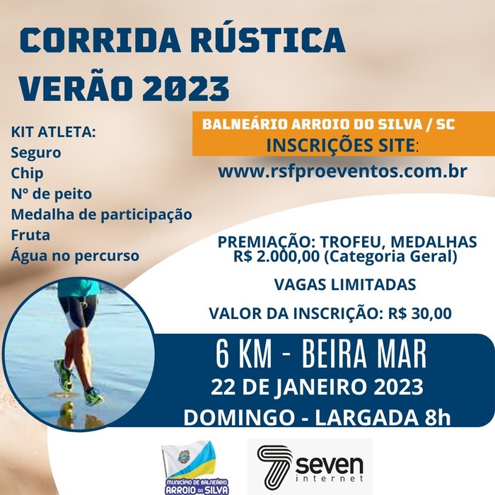 Estão abertas as inscrições para a Corrida Rústica Seven Internet Verão 2023 em Balneário Arroio do Silva. O evento será realizado no dia 22 de janeiro (domingo) com largada às 8h na área central. O trajeto será à beira-mar com percurso de 6km.