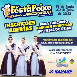 Estão abertas as inscrições para o concurso que irá eleger a Rainha e as Princesas da Festa do Peixe 2023 de Balneário Arroio do Silva. Garotas entre 16 a 26 anos, que sejam moradoras fixas do município, podem participar. (O regulamento completo, com todos os requisitos, está no site da Prefeitura)