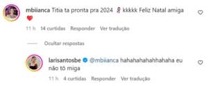 Larissa Santos, do BBB 23, está passando o natal com sua família em Sombrio e Balneário Gaivota e em uma das fotos postadas pela sister foi para mostrar o look natalino usando verde e recebeu incentivo de uma amiga: “Titia pronta”, ela comentou. A influencer, no entanto, garantiu que ainda não está preparada para ter um bebê. Tudo no seu tempo, né?.