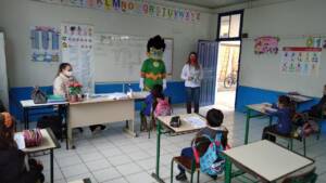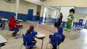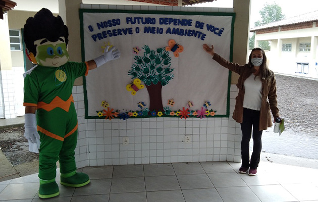A engenheira ambiental, Andréia Arcaro Tonetto, junto ao personagem Incrível Atom, passaram nas escolas para entregar as revistas e deixar uma mensagem aos estudantes.