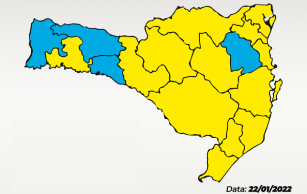 A Matriz de Risco Potencial Regionalizado divulgada neste sábado, 22, aponta 13 regiões classificadas como risco potencial alto (cor amarelo) e quatro no nível de risco moderado (cor azul). Em um comparativo com o relatório divulgado na semana anterior, as regiões do Extremo Oeste, Médio Vale do Itajaí e Xanxerê, que estavam classificadas no nível alto (amarelo), tiveram melhora nos indicadores e passaram a ser classificados no nível moderado (azul), juntando-se ao Alto Uruguai Catarinense. Já o Vale do Itapocú, que estava no nível moderado (azul), teve piora na dimensão transmissibilidade, se juntando às regiões do Alto Vale do Itajaí, Alto Vale do Rio do Peixe, Carbonífera, Extremo Sul Catarinense, Foz do Rio Itajaí, Grande Florianópolis, Laguna, Meio Oeste, Nordeste, Oeste, Planalto Norte e Serra Catarinense que se mantiveram no nível alto (amarelo).