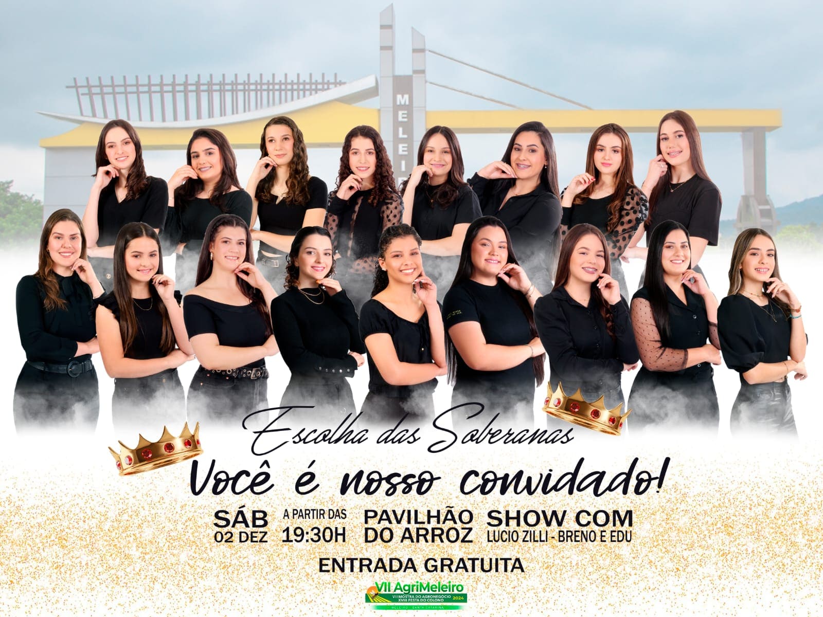 A Prefeitura Municipal de Meleiro e a Comissão central Organizadora, homologou o nome de 17 candidatas, representando as respectivas comunidades, no evento de escolha da Rainha e Princesas, que será no dia 02 de Dezembro, no Pavilhão do Arroz. Pelas fotos e apresentações nas redes sociais, será uma disputa bastante acirrada entre as candidatas. Na noite de escolha haverá shows com Lúcio Zilli e Brenno e Edu.
