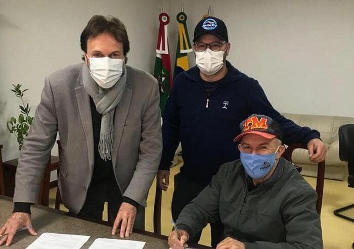 Prefeito de Araranguá César Cesa com Antônio Augusto Rossi e Eraldo Vieira proprietário do Caverá Country Clube. O Clube recebeu apoio municipal para as atividades artísticas, tradicionais e culturais no evento Duelo Rei das Águas do Caverá, que será realizado dias 14 e 15 agosto.