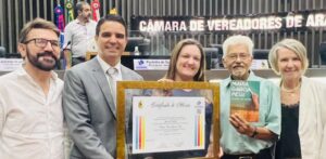Vereador Júnior do Bailão entregou a diretora Helenice Defaveri a Honraria ao Colégio Maria Garcia Pessi celebrando 95 anos de bons ensinamentos. No registro com o escritor e professor Pedro Paulo Cardoso do livro EEB Maria Garcia Pessi, sendo emoldurados pelo seu pai Luiz do Bailão e a ex-vereadora Lena Perico.