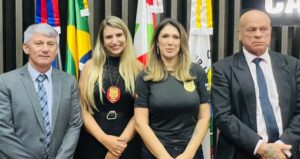 Delegada de Polícia e presidente da CMDM Araranguá, Eliane Chaves falou na tribuna da Câmara sobre feminicídio a indicação foi do colega e vereador Jorge Giraldi. No registro com a colega Natália Rebel e o presidente da Câmara vereador Paulinho.