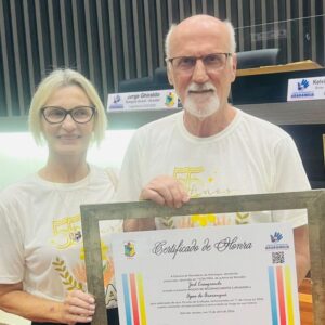 Presidente da Apae de Araranguá, Sadi Possamai e a esposa Saletinha na Moção de Reconhecimento e Aplausos aos 55 anos da instituição no Legislativo Araranguá de autoria do vereador Joel Casagrande.