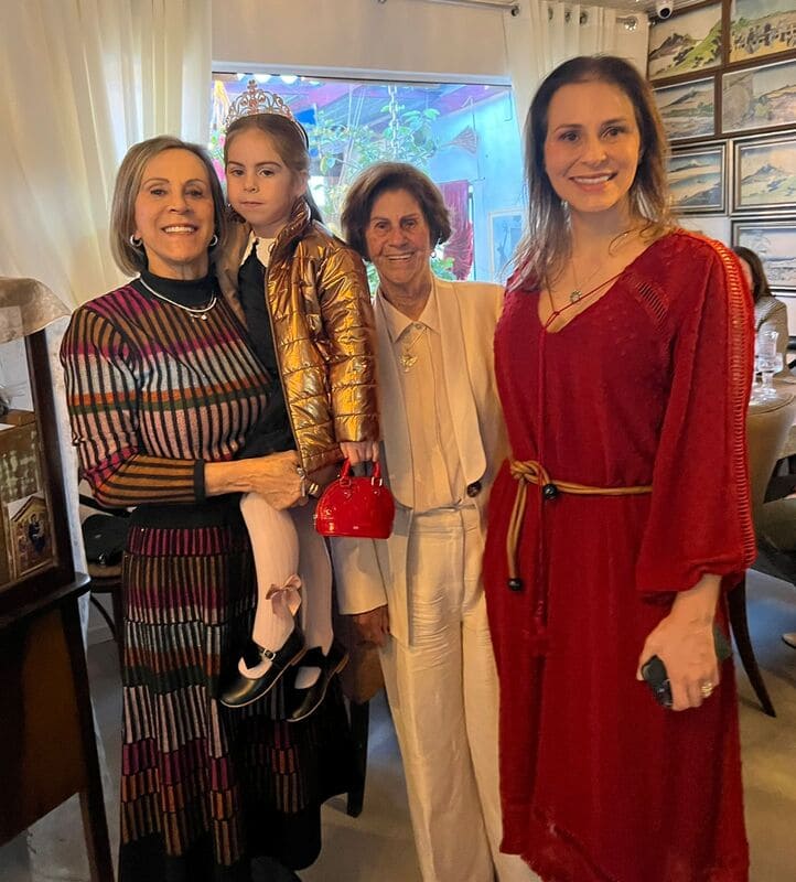 Almira Pascoali celebrou aniversário rodeada de amigas na LacVecchia Botega. No registro com a filha Ângela, a neta Natália e a princesa Maria.