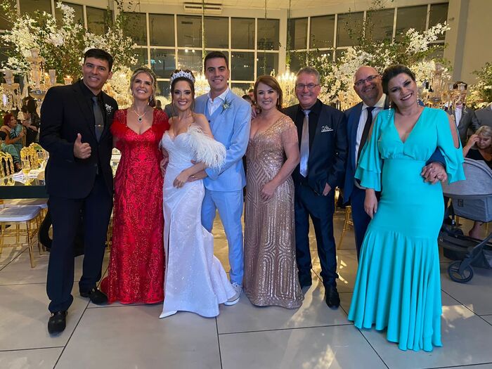 Os noivos lindos, Helena Nuenberg e Filipe Sandrini. Ele filho de Rejane e Darlan Lopes. A noiva com a mãe Giovana e o padrasto Lúcio e o pai Ed Carlo Nuenberg e Juliana.