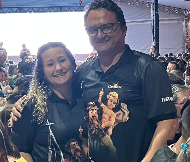 Padre Daniel pároco da Igreja Sagrada Família, vereadora de Araranguá Lena Périco e os noveneiros André Zanette e Georgia. No concorrido bingo em prol da Festa em Honra a São Cristóvão.
