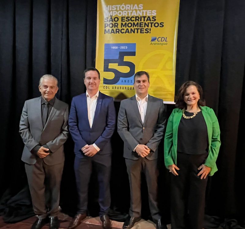 Prefeito de Araranguá César Cesa, deputado estadual Tiago Zilli, Onildo Dalbosco Júnior presidente FCDL, presidente do Poder Legislativo vereador Luciano Pires na entrega alusiva aos 55 Anos ao presidente do CDL Everaldo João.