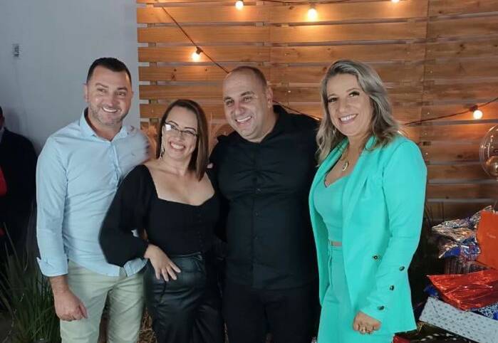 Sr. Alveri Sá com a filha Valéria e o marido Fábio Machado nos cumprimentos com Dr. Martinho e Negra Guizzo, a neta Letícia e o namorado Bruno Prietto. Almoço no Veleiro, as famílias se reencontram.