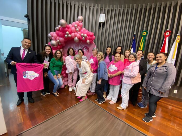 Presidente do Poder Legislativo de Araranguá, vereador Jair Anastácio e a vereadora Lena Périco aderiram ao Outubro Rosa. No registro com servidoras e mulheres da Associação Rede Feminina de Combate ao Câncer.