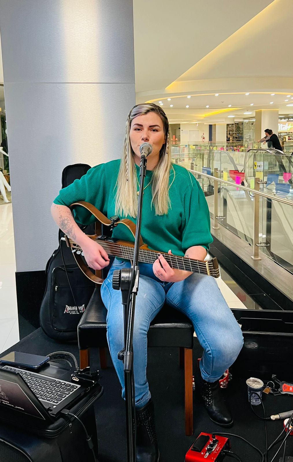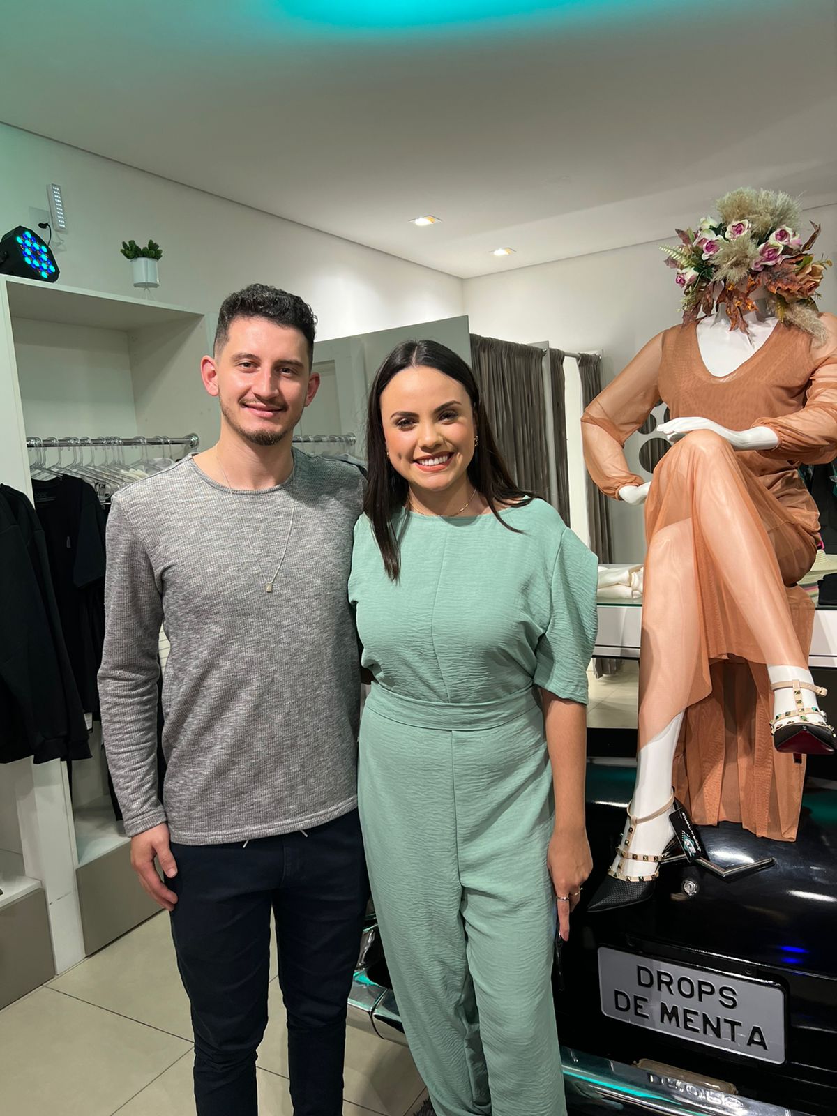 Jonahtan e Bárbara elegantes na loja Drops de Menta no Infinity Shopping.