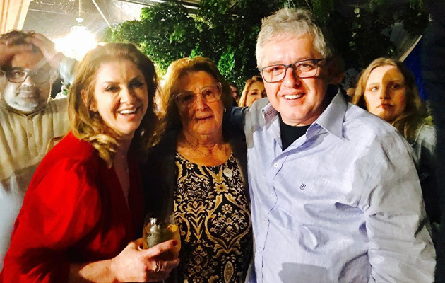 Luci e Tiago Zilli emoldurando a mãe dela dona Pupa, após emocionante discurso da aniversariante agradecendo a vida, família e amigos. Festa cinematográfica.