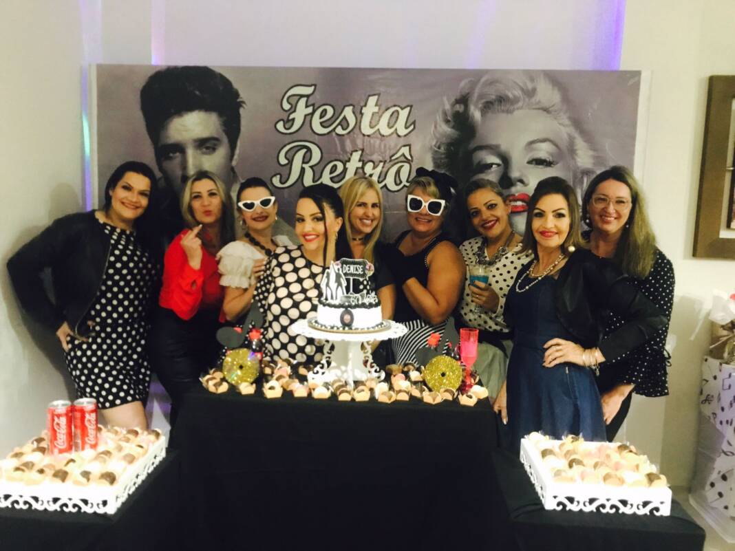 Denise Santos celebrando aniversário com Festa Retrô. Na moldura com as amigas Georgia, Berenice, Andressa, Marina, Lena, Franciesca, Mail e Carla.