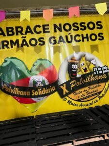 A prefeita de Sombrio Gislaine Cunha prestigiou a X Polvilhana no registro com os anfitriões do Poder Executivo e Legislativo de Santa Rosa do Sul. Foto em frente local de arrecadação de donativos RGS.