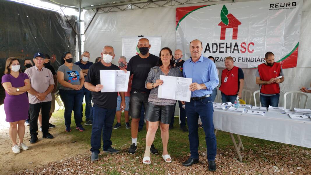 A entrega das matrículas foi realizada pela Prefeitura, pela Comissão Municipal de Regularização Urbana e Adehasc – empresa responsável.