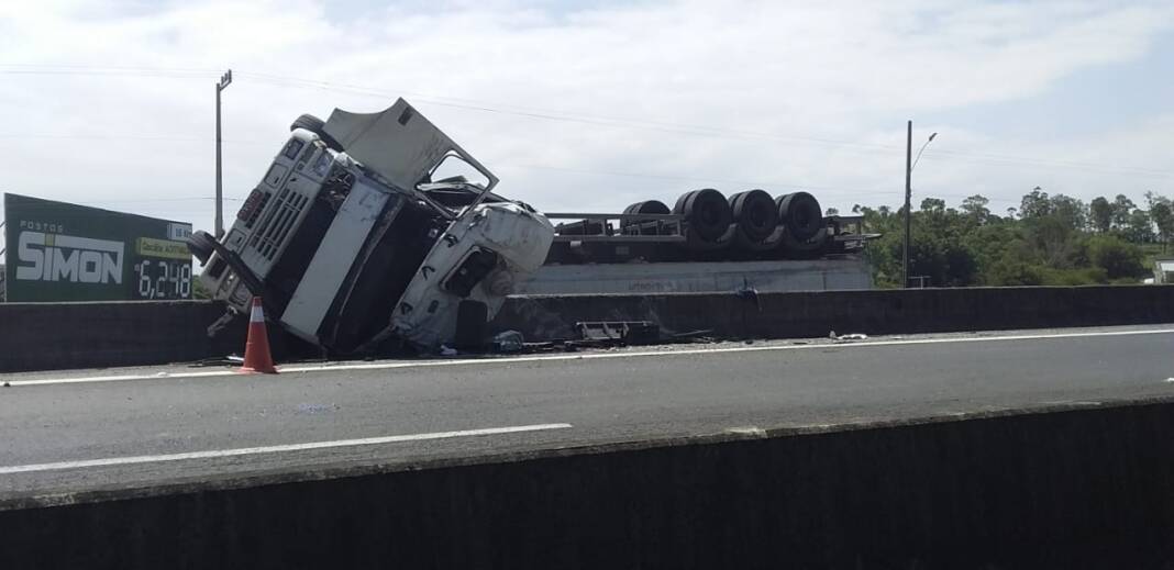 Carreta tomba em Maracajá: “o baú começou a balançar”, relata o motorista