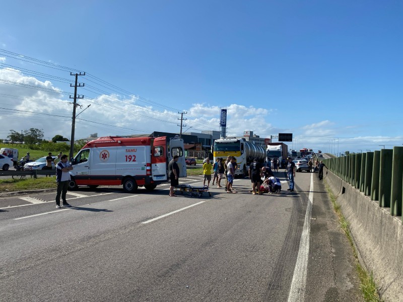 Uma mulher, com idade estimada entre 40 e 50 anos, foi atropelada por um caminhão enquanto atravessava a BR-101, no sentido sul, próximo ao Combo Atacadista, em Sombrio.