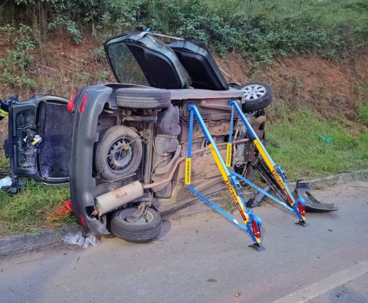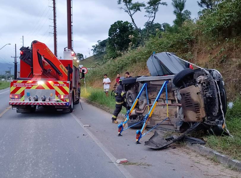 O capotamento foi registrado na rua Augusto Demarchi, no bairro Três Rios do Sul, na tarde desta quinta-feira (11).
