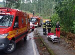 Os bombeiros foram acionados ao chegar no local encontraram um veículo que saiu de pista, vindo a cair em uma ribanceira, com cerca de 15 metros, onde ficou apoiado em uma árvore.
