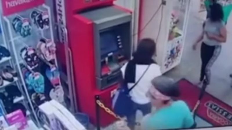 No vídeo é possível ver o momento que a mulher faz a transação e sai da farmácia sem esperar o dinheiro ser liberado pelo caixa eletrônico.